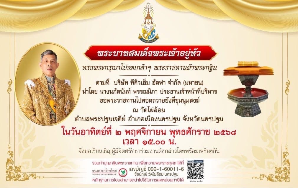 ด้วย พระบาทสมเด็จพระเจ้าอยู่หัว ทรงพระกรุณาโปรดเกล้าฯ พระราชทานผ้าพระกฐิน ตามที่ บริษัท ทีคิวเอ็ม อัลฟา จำกัด (มหาชน) นำโดย นางนภัสนันท์ พรรณนิภา ประธานเจ้าหน้าที่บริหาร ขอพระราชทานไปทอดถวายยังที่ชุมนุมสงฆ์ ณ วัดไผ่ล้อม ตำบลพระปฐมเจดีย์ อำเภอเมืองนครปฐม จังหวัดนครปฐม ในวันอาทิตย์ที่ 2 พฤศจิกายน พ.ศ.2568 เวลา 15.00 น.