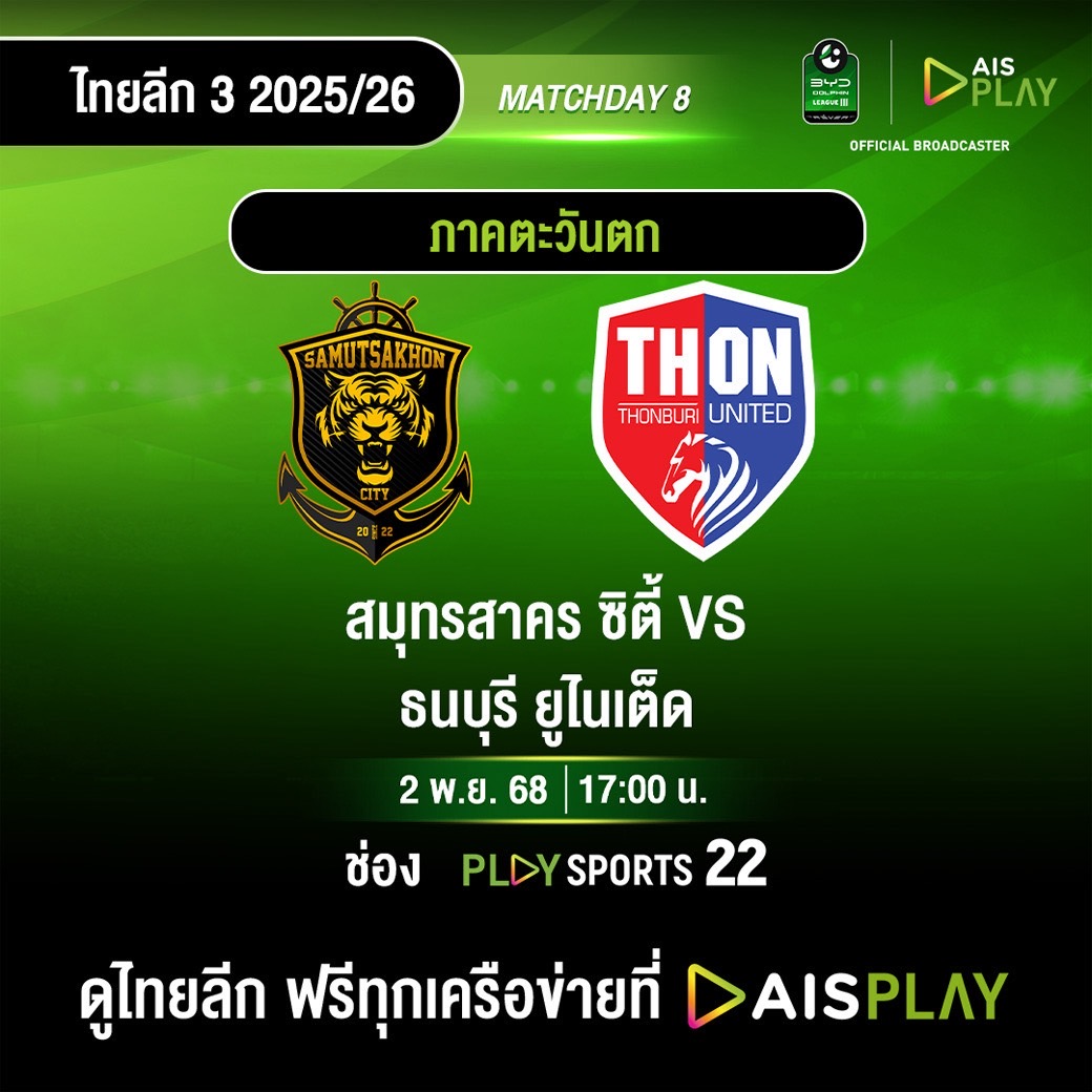 ไฮไลท์ของโซนภาคตะวันตกคงหนีไม่พ้นการเจอกันของ 2 ทีมหัวตาราง โดย “พยัคฆ์สาคร ” สมุทรสาคร ซิตี้ รองจ่าฝูงของโซน จะเปิดบ้านรับการมาเยือนของ “ม้าศึกฝั่งธน” ธนบุรี ยูไนเต็ด“ ทีมนำของโซนตะวันตก ที่สนามม.การกีฬาแห่งชาติวิทยาเขตสมุทรสาคร ในวันอาทิตย์ที่ 2 พฤศจิกายน เวลา 17.00 น. ถ่ายทอดสดทาง AIS PLAY SPORTS22