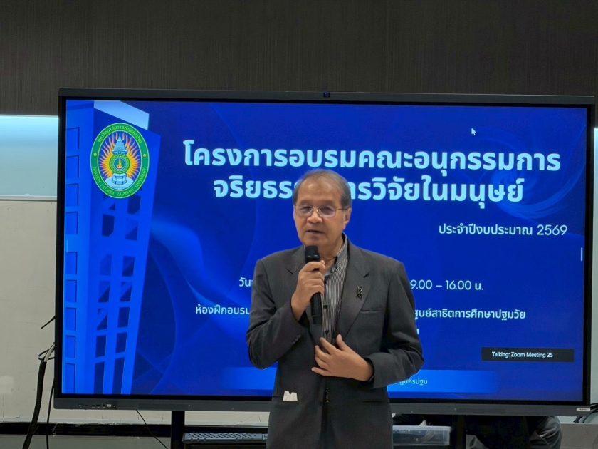 เมื่อวันที่ 3 พฤศจิกายน 2568 ผู้ช่วยศาสตราจารย์ ดร.โยธิน ศรีโสภา ประธานคณะอนุกรรมการจริยธรรมการวิจัยในมนุษย์ มหาวิทยาลัยราชภัฏนครปฐม กล่าวต้อนรับวิทยากรและกล่าวเปิดโครงการอบรมคณะอนุกรรมการจริยธรรมการวิจัยในมนุษย์ ระหว่างวันที่ 3 – 4 พฤศจิกายน 2568 ณ ห้องฝึกอบรม 2 ชั้น 1 อาคารปฏิบัติการครุศาสตร์และศูนย์สาธิตการศึกษาปฐมวัย คณะครุศาสตร์