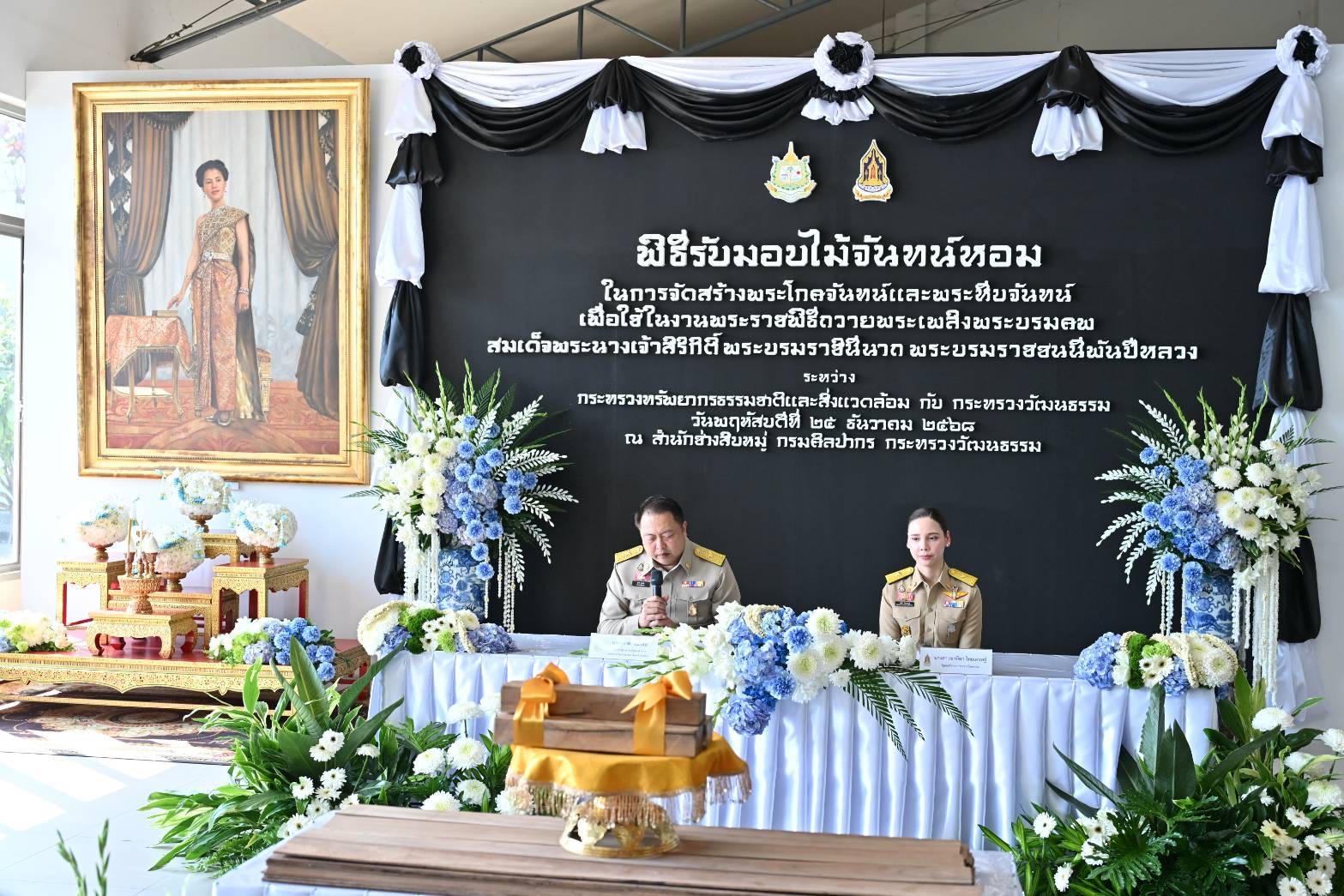 วันที่ 25 ธันวาคม 2568 เวลา 15.09 น. ที่สำนักช่างสิบหมู่ กรมศิลปากร ตำบลศาลายา อำเภอพุทธมณฑล จังหวัดนครปฐม นายสุชาติ ชมกลิ่น รองนายกรัฐมนตรีและรัฐมนตรีว่าการกระทรวงทรัพยากรธรรมชาติและสิ่งแวดล้อม เป็นประธานพิธีส่งมอบไม้จันทน์หอม ให้กับกระทรวงวัฒนธรรม เพื่อใช้ในงานพระราชพิธีถวายพระเพลิงพระบรมศพ สมเด็จพระนางเจ้าสิริกิติ์ พระบรมราชินีนาถ พระบรมราชชนนีพันปีหลวง โดยนางสาวซาบีดา ไทยเศรษฐ์ รัฐมนตรีว่าการกระทรวงวัฒนธรรม เป็นประธานรับมอบ พร้อมด้วย ปลัดกระทรวงวัฒนธรรม อธิบดีกรมอุทยานแห่งชาติ สัตว์ป่า และพันธุ์พืช อธิบดีกรมศิลปากร ผู้ว่าราชการจังหวัดนครปฐม รองผู้ว่าราชการจังหวัดประจวบคีรีขันธ์ หัวหน้าส่วนราชการ ข้าราชการ เจ้าหน้าที่จากหน่วยงานต่างๆ และประชาชน ร่วมพิธีในครั้งนี้