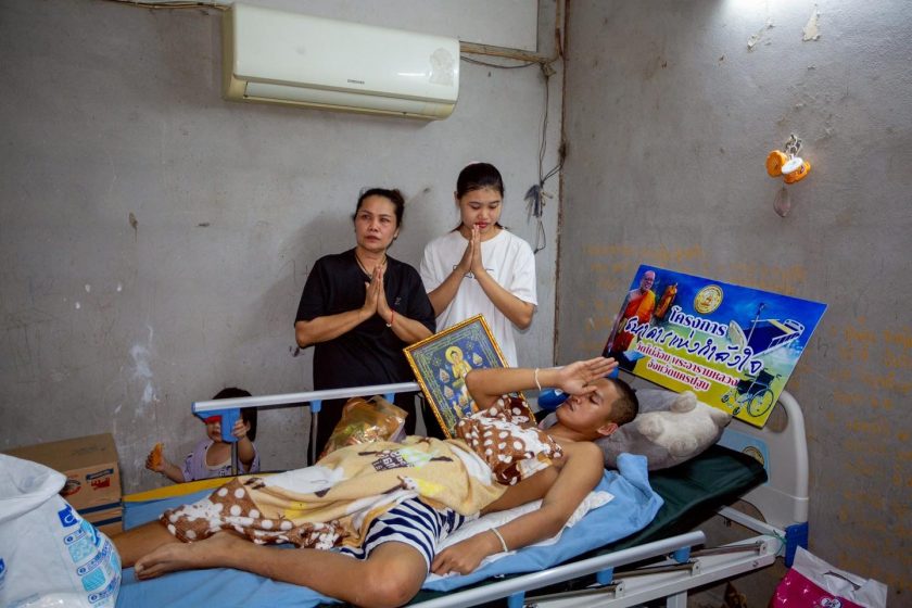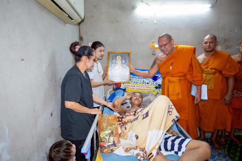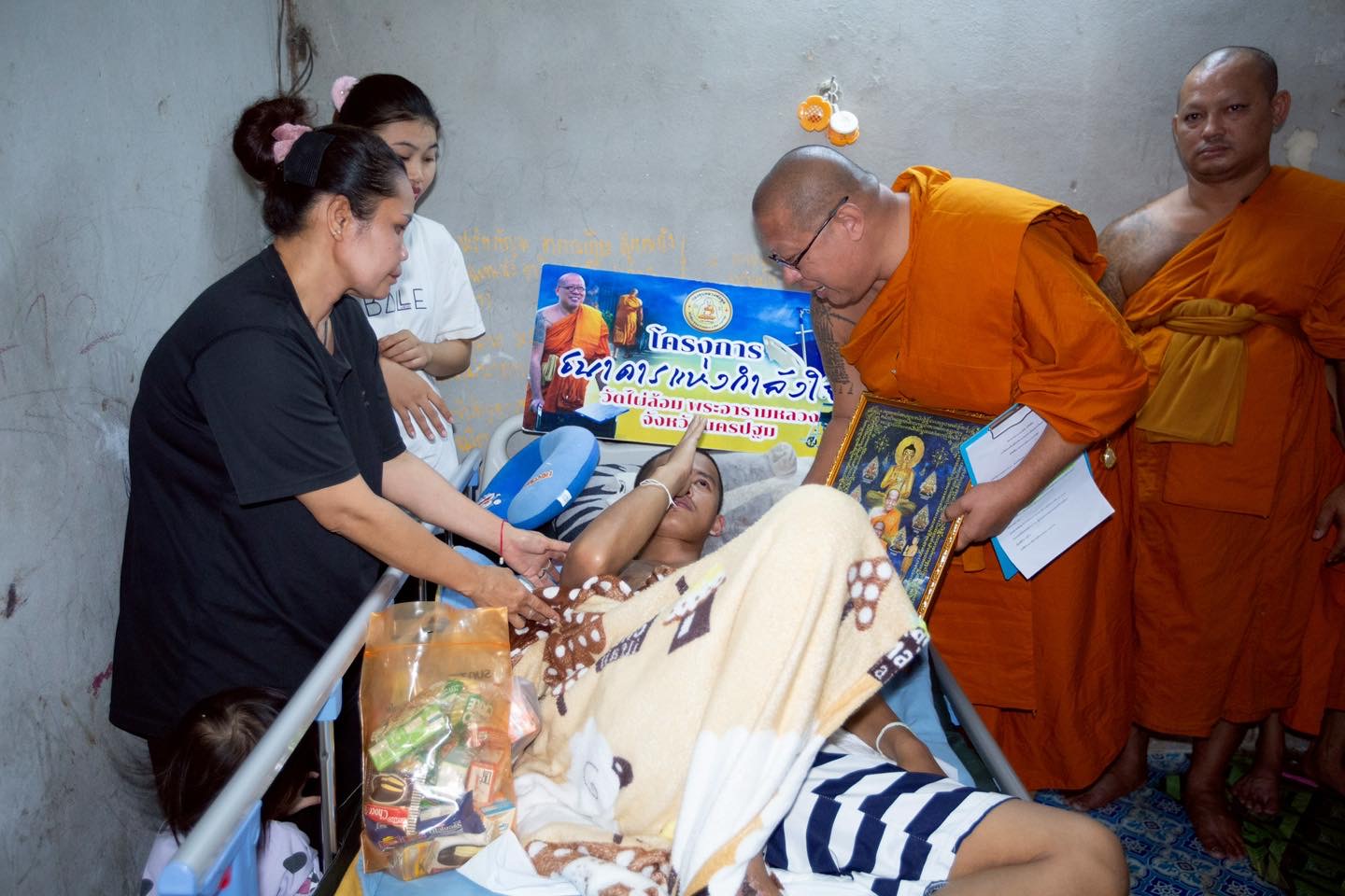 ทางด้าน พระครูปลัดสิทธิวัฒน์ (หลวงพี่น้ำฝน) ได้กล่าวว่า วันนี้เป็นอีกหนึ่งที่ อาตมา…ได้เดินทางออกมาช่วยเหลือสงเคราะห์โยมผู้ป่วยภาวะอัมพฤกษ์ซีกซ้ายจากอุบัติเหตุ ในบ้านหลังเล็กที่ตำบลห้วยม่วง อำเภอกำแพงแสน จังหวัดนครปฐม เพื่อมอบเตียงผู้ป่วย ในโครงการธนาคารเตียงและรถวีลแชร์ ลำดับที่95 อาตมา…ได้นำเตียงผู้ป่วย พร้อมข้าวสาร น้ำดื่ม และของอุปโภคบริโภค มอบให้ครอบครัว นายโชคชัย กันทะมัง อายุ 25 ปีผู้ป่วยภาวะอัมพฤกษ์ซีกซ้ายจากอุบัติเหตุ พูดไม่ชัด กลืนอาหารไม่ได้ ต้องให้อาหารเหลวทางสายยาง ชีวิตของครอบครัวเล็ก ๆ จำนวน 4 คน มีผู้ป่วย แม่ ภรรยา และลูกสาววัยขวบครึ่ง ทั้งครอบครัว มีรายได้ทั้งบ้าน มาจากภรรยาที่ทำงานเดือนละ 12,000 บาท และพักอาศัยในบ้านพักคนงาน ค่าเช่าเพียง 400บาทต่อเดือน ภาพที่เห็นวันนี้ไม่ใช่ความสงสารแต่คือ “ความเข้มแข็งของหัวใจคนเป็นแม่และภรรยา”ที่ดูแลผู้ป่วยด้วยความรักไม่ย่อท้อและคือ “พลังของการให้” จากผู้มีศรัทธาทุกท่านที่ทำให้เตียงหนึ่งเตียง กลายเป็นที่พักกายและกำลังใจหนึ่งก้อน กลายเป็นแรงพยุงใจทั้งครอบครัวอาตมา…ขออนุโมทนาบุญกับผู้ให้ทุกท่าน