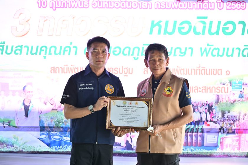 วันที่ 10 กุมภาพันธ์ 2569 ที่บริเวณหน้าสถานีพัฒนาที่ดินนครปฐม ตำบลทุ่งขวาง อำเภอกำแพงแสน จังหวัดนครปฐม นายยงยุทธ สวนทอง รองผู้ว่าราชการจังหวัดนครปฐม เป็นประธานเปิดงานวันหมอดินอาสา กรมพัฒนาที่ดิน ประจำปี 2569 โดยสถานีพัฒนาที่ดินนครปฐม จัดขึ้น ภายใต้หัวข้อ “3 ทศวรรษ หมอดินอาสา สืบสานคุณค่า ต่อยอดภูมิปัญญา พัฒนาดินไทย” เพื่อเป็นการเชิดชูเกียรติแก่หมอดินอาสากรมพัฒนาที่ดิน ที่สร้างคุณประโยชน์ต่อสาธารณชนมาอย่างยาวนาน ร่วม 30 ปี อีกทั้งเพื่อความสัมพันธ์ระหว่างหมอดินอาสา และเจ้าหน้าที่กรมพัฒนาที่ดิน ตลอดจนเป็นเวทีแลกเปลี่ยนเรียนรู้ ระหว่างหมอดินอาสาทุกช่วงวัย และสร้างความเข้มแข็ง ให้กับเครือข่ายหมอดินอาสา ในการขับเคลื่อนภารกิจ ด้านการใช้ที่ดิน อย่างมีประสิทธิภาพและยั่งยืน