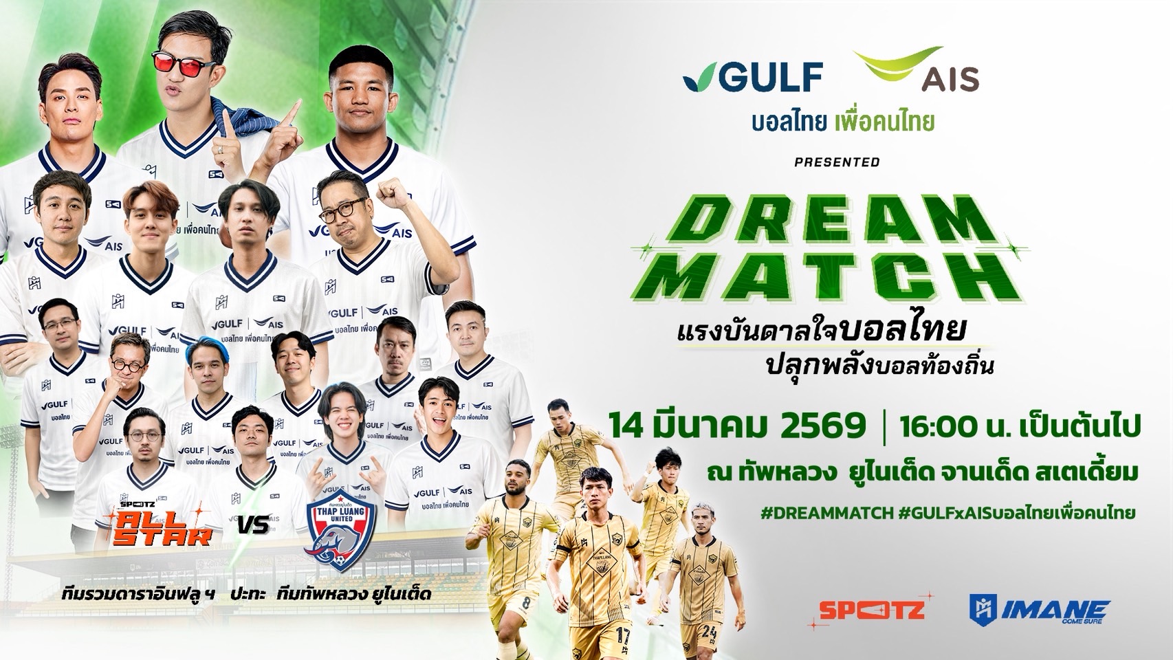 GULF-AIS สานต่อเจตนารมณ์ “บอลไทยเพื่อคนไทย” เดินหน้ายกระดับวงการฟุตบอลรากหญ้า จัดแมตช์พิเศษ “Dream Match แรงบันดาลใจบอลไทย ปลุกพลังบอลท้องถิ่น” สร้างปรากฏการณ์ครั้งยิ่งใหญ่ที่นำทีมรวมดาราอินฟลูเอ็นเซอร์ชื่อดังมาฟาดแข้งกับสโมสรฟุตบอลท้องถิ่นที่ครองใจคนในพื้นที่ หวังสร้างแรงบันดาลใจและปลุกกระแสฟุตบอลชุมชนให้กลับมาคึกคัก พร้อมเปลี่ยนรายได้จากการจำหน่ายบัตรเป็นอุปกรณ์การเรียนมอบให้โรงเรียนในพื้นที่